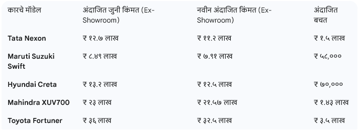 नवीन GST दरांमुळे कोणत्या कार किती स्वस्त झाल्या आहेत, हे खालील तक्त्यावरून समजून घेता येईल: